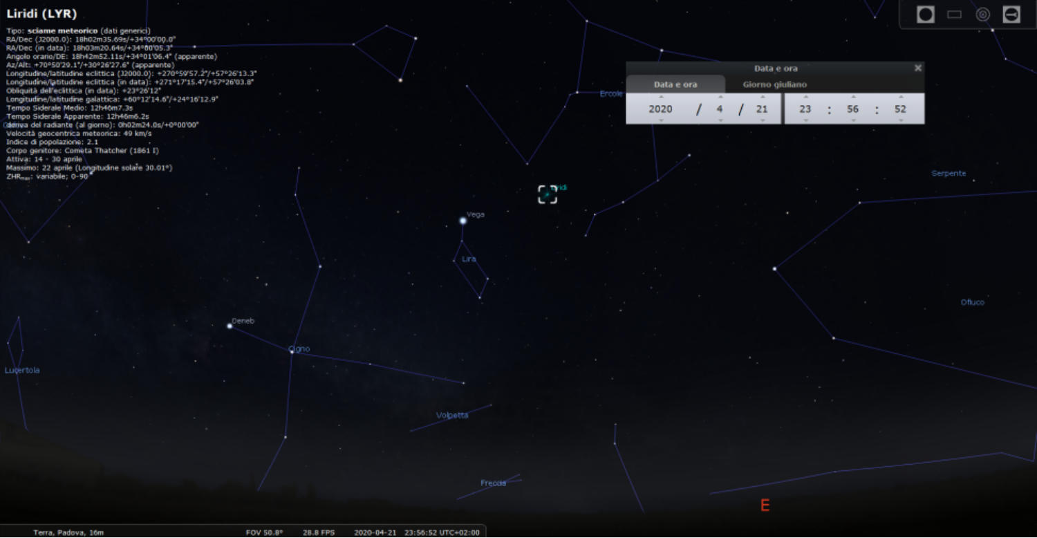 Cosa possiamo osservare in questo periodo?( di Ivan Codato)Sciame delle Liridi. Si tratta di un fenomeno che si replica tutti gli anni in primavera nel periodo tra il 15 e il 28 aprile dovuto ai residui lasciati dalla cometa G/1861 G1 Thatcher che transita ogni 415 anni. Questa pioggia di meteore è osservabile nella costellazione della Lira, da cui ne tre la denominazione, e quest'anno avrà il suo culmine tra il 21 e il 22 aprile.La narrazione, a proposito di questo evento, racconta che le Liridi che furono osservate già nel 687 a.C. da astronomi cinesi.Dove guardare? Ovviamente il riferimento è la costellazione della Lira dove domina con il suo splendore Vega, stella facilmente individuabile proprio per la sua luminosità. L'immagine qui riportata ed estratta da Stellarium mostra la posizione delle Liridi in data 21 aprile a mezzanotte circa. Si vede la stella Vega e alla sua destra si dovrebbe intercettare lo sciame meteorico e, sempre riferito a quel momento, ad una altezza di circa 30° dall'orizzonte ad Est-Nord-Est. Il numero ZHR, che indica la quantità di meteore osservabili in condizioni ottimali (buio e allo zenit) è 25.Buona osservazioneLa cometa C/2019 Y4 ATLASNel prossimo mese di maggio probabilmente o almeno speriamo, potremo osservare a occhio nudo la cometa C/2019 Y 4 ATLAS.Il nome ATLAS deriva dal fatto che la cometa è stata scoperta dal sistema automatizzato per la ricerca di corpi celesti potenzialmente pericolosi per la Terra, acronimo che sta per Asteroid Terrestrial-Impact Last Alert System, il 28 dicembre 2019, dove il mese è definito dalla lettera Y mentre il 4 sta per indicare il quarto oggetto rilevato in quel lasso di tempo, secondo la denominazione delle comete dell'Unione Astronomica Internazionale. La sigla C/ indica che è una cometa non periodica, cioè con un periodo orbitale superiore ai 200 anni, quindi per noi sarà l'unica opportunità per osservarla: per curiosità, il periodo è stato calcolato in circa 6000 anni.Al momento della scoperta la sua magnitudine era di +19, ma già a gennaio la luminosità era salita di 5 punti il che ha fatto alzare l'attenzione della comunità scientifica, e non solo, in prospettiva del suo approssimarsi al Sole.La distanza sempre in data della scoperta era di circa 430 mln di Km dalla nostra stella.A maggio, dicevamo, la cometa passerà nel punto più prossimo al nostro pianeta e precisamente questo avverrà sabato 23 quando la sua distanza sarà di circa 116 mln di Km, il 31 sarà al suo perielio ad una distanza di soli 37 mln di Km dal Sole.E la sua magnitudine? E qui che incominciano gli scongiuri. Infatti, non è la prima volta che le prospettive di osservare comete luminose sono poi clamorosamente fallite perché all'avvicinarsi al nostro Sole queste sono "scemate", quindi prudenza! Ma, ipotizzando che tutto possa andare per il verso giusto, gli scienziati prevedonouna quasi una prima magnitudine o comunque un valore valido per l'osservazione a occhio nudo. Al momento che scrivevo questo breve articolo, eravamo ai primi di aprile, la magnitudine era di + 11 circa ad una distanza di 155 mln Km. e tutto faceva ben sperare per buona osservazione anticipata.Ma oggi 17 aprile, dopo un paio di settimane, il riscontro invece è stato deludente: la cometa si è frantumata in più pezzi perdendo la consistenza e quindi non sarà facilmente visibile. Dove osservare? Sempre considerando il mese di maggio, nella prima decade, sarà visibile appena dopo il tramonto nella costellazione della Giraffa, Nord Ovest, all'altezza di circa 40°. Nella seconda decade, passerà nella costellazione del Perseo; dopodiché l'osservazione sarà sempre più difficile in quanto si abbasserà dimolto all'orizzonte e la vicinanza al Sole la renderà non visibile.L'ausilio di un discreto binocolo, un 8X30 o 10X50, faciliterà la sua osservazione ed apparirà come un batufolo. Utilizzando anche un piccolo telescopio (30-50 ingrandimenti) sarà possibile osservare la sua chioma, che fotografata ha evidenziato un bellissimo colore verde, e parte della coda. Le coordinate sono rintracciabilinei siti scientifici che trattano l'argomento.Buona osservazione.